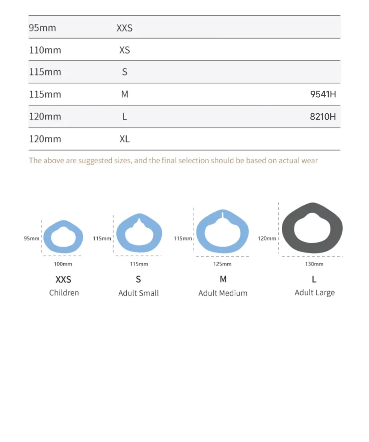 - KN95: 8210 (L size), 9541 (M size), 7711 (S size), 95SH (XXS size)
